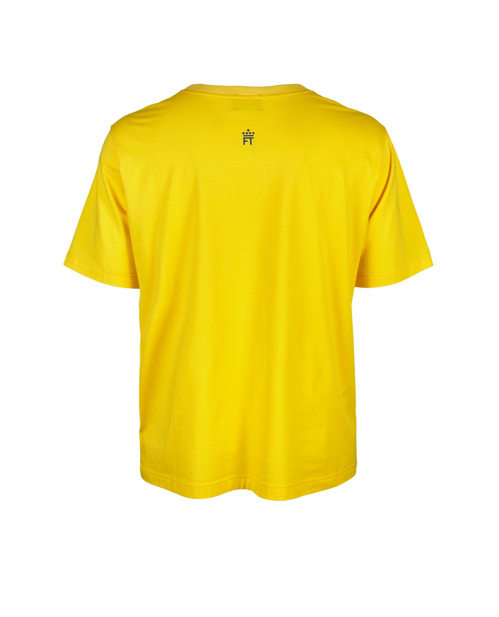 Футболка прямого кроя из хлопка с принтом, модель желтого цвета, на спине мелкий логотип бренда "Fashion Town". Длина в размере 3XL - 80 см