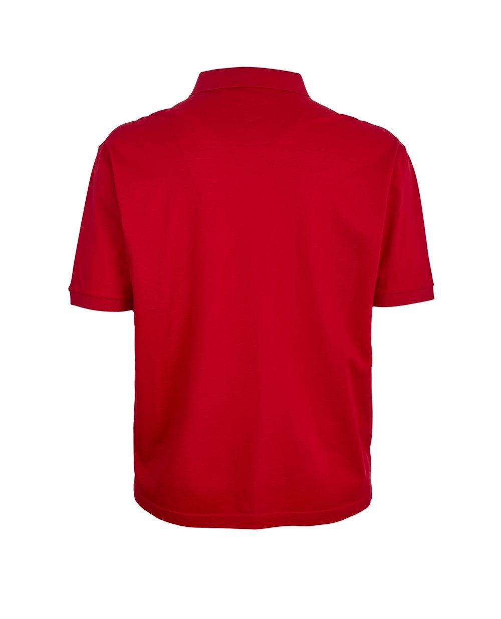 Поло красного цвета Montechiaro. Воротник и края рукавов из плотного трикотажа, застежка-поло на три пуговицы. Гладкая хлопковая ткань, накладной карман. Модель прямого силуэта с короткими рукавами и отложным воротником.