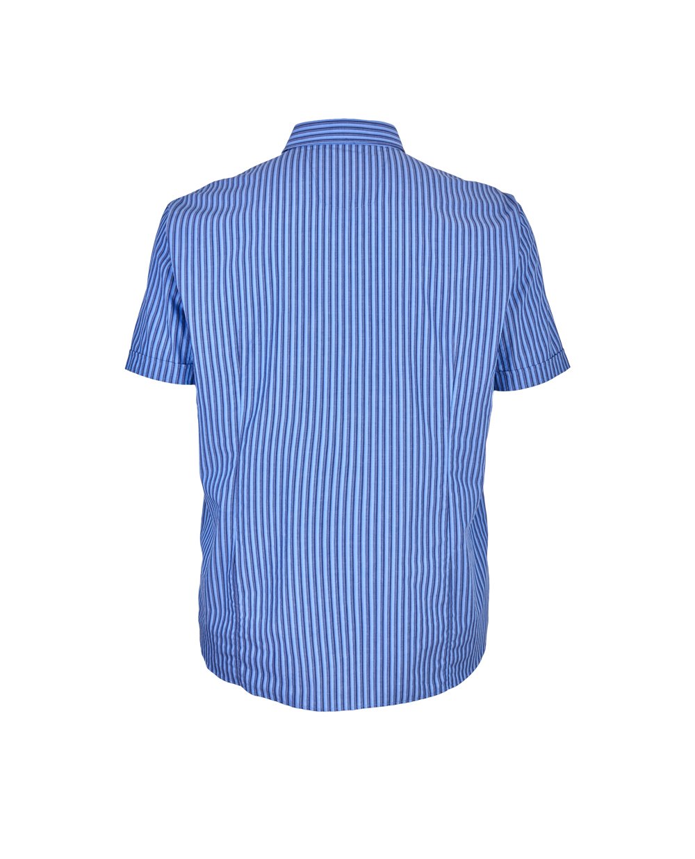 Хлопковая рубашка немецкого бренда Signum с коротким рукавом, прямого кроя, ткань в полоску из пяти цветов - графит, синий, голубой, сиреневый и белый, которые гармонично сочетаются между собой.