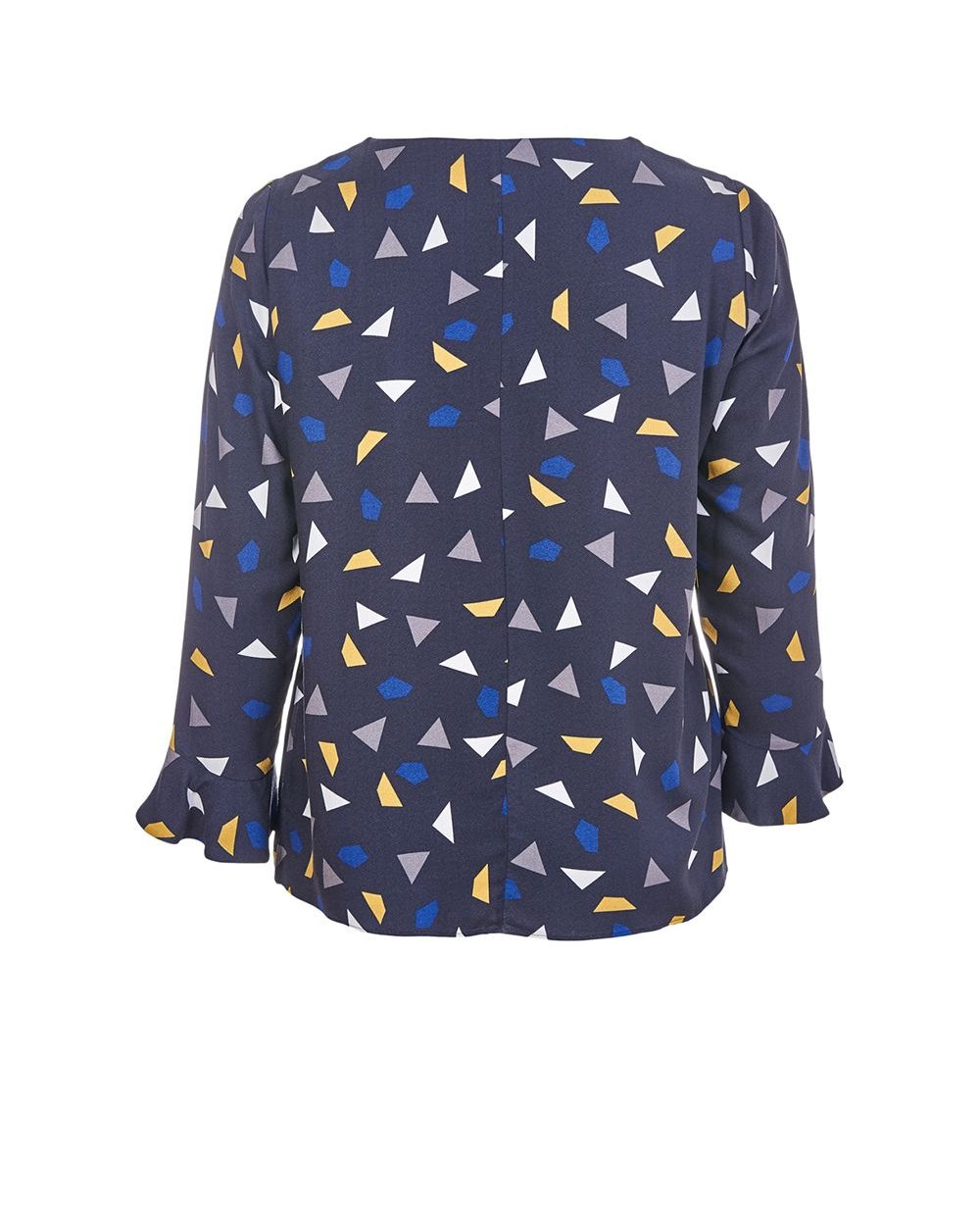 Блуза прямого кроя с рукавами колокол и V-образным вырезом, разрезы по бокам. Геометрический принт.