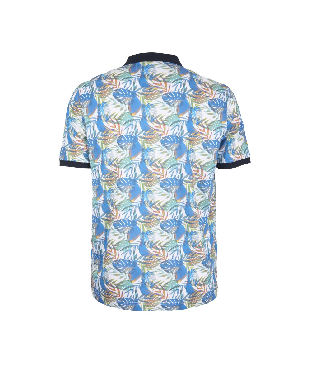 Поло с коротким рукавом из тонкой хлопковой ткани, застёжка на три пуговицы, отделка в виде контрастного воротника и окантовки на рукавах, внизу по бокам разрезы. Длина в размере 3XL - 80 см