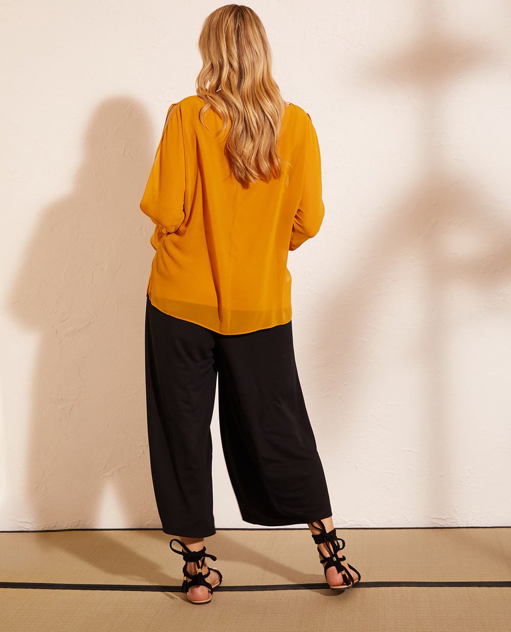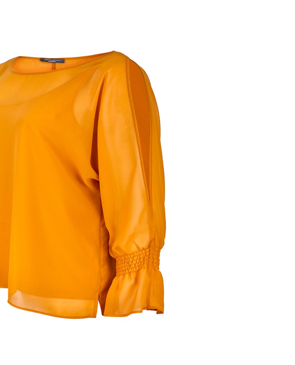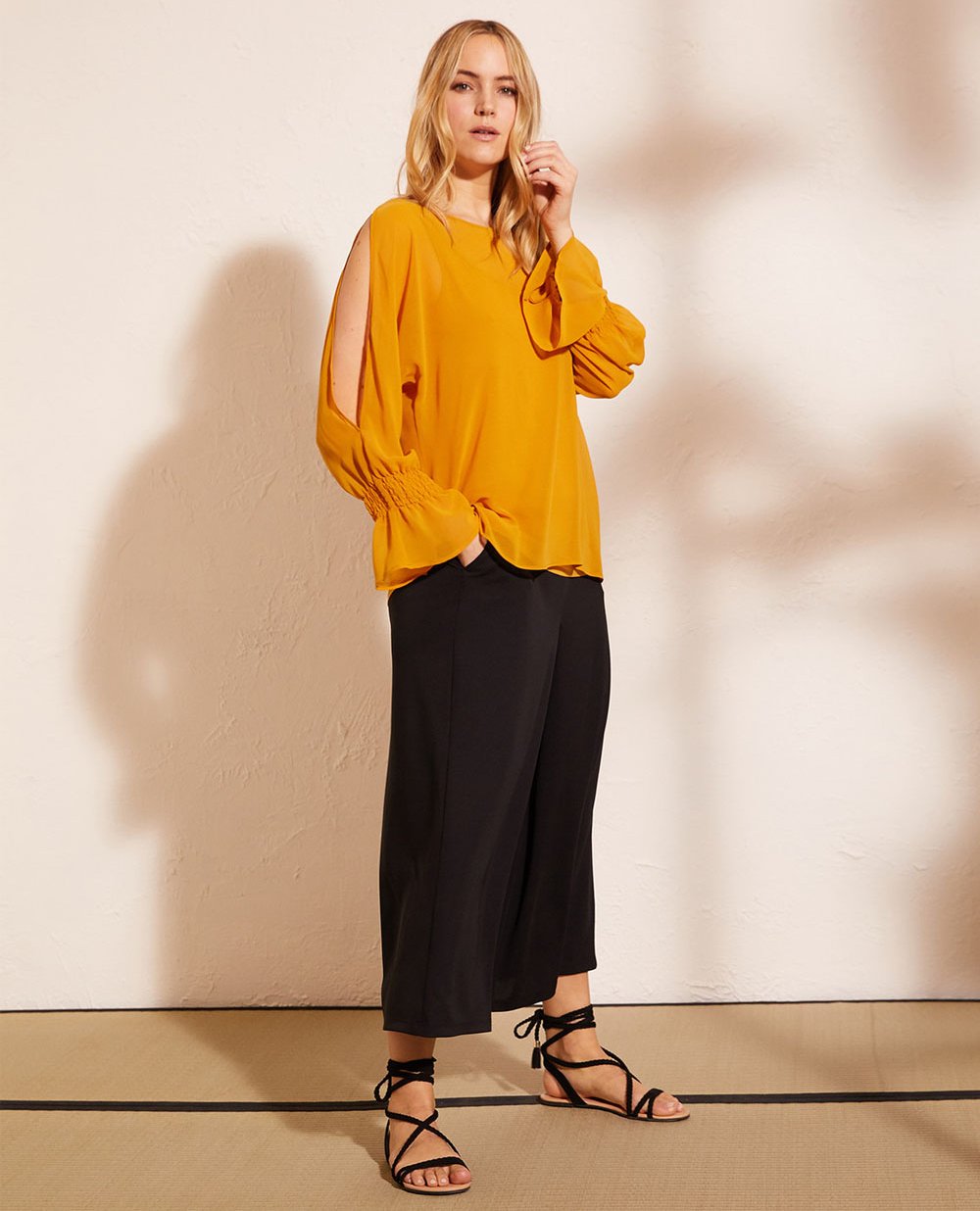 Элегантная двойная блуза Elena Miro: верх из эко-шифона, горловина лодочка, свободного силуэта по бокам с разрезами, длинный рукав с разрезом по всей длине до манжета, который выполнен из нескольких рядов резинки, низ рукава расширяется в колокол. Нижняя часть блузы - трикотажный топ из вискозы. В 41 размере длина 72 см.