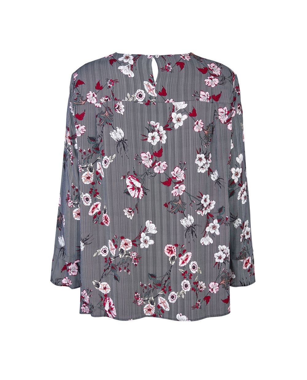 Удлиненная блуза прямого кроя из легкой, струящейся ткани с комбинированным принтом: тонкая вертикальная полоска и яркий цветочный рисунок. Модель с застежкой по спинке на пуговице. По боковым швам блузы небольшие закругленные разрезы. Круглый вырез горловины, декорирован отделочной строчкой. Длинный втачной рукав. На спинке отрезная кокетка. Длина изделия в 52 размере 85 см.