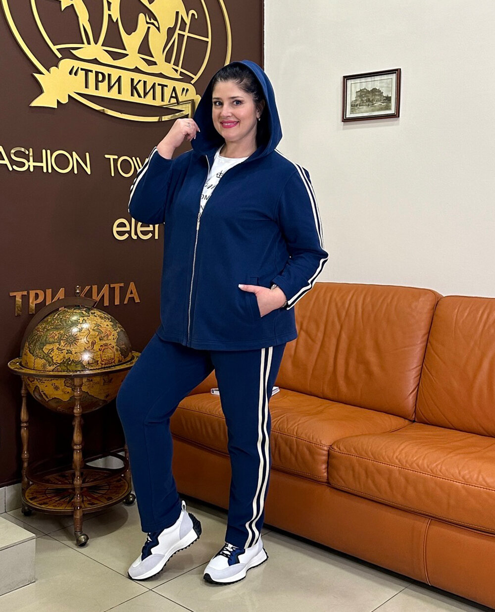 Костюм коллекции Fashion Town синего цвета с лампасами. Модель с капюшоном. Состав: 80% хлопок, 20% полиэстер.