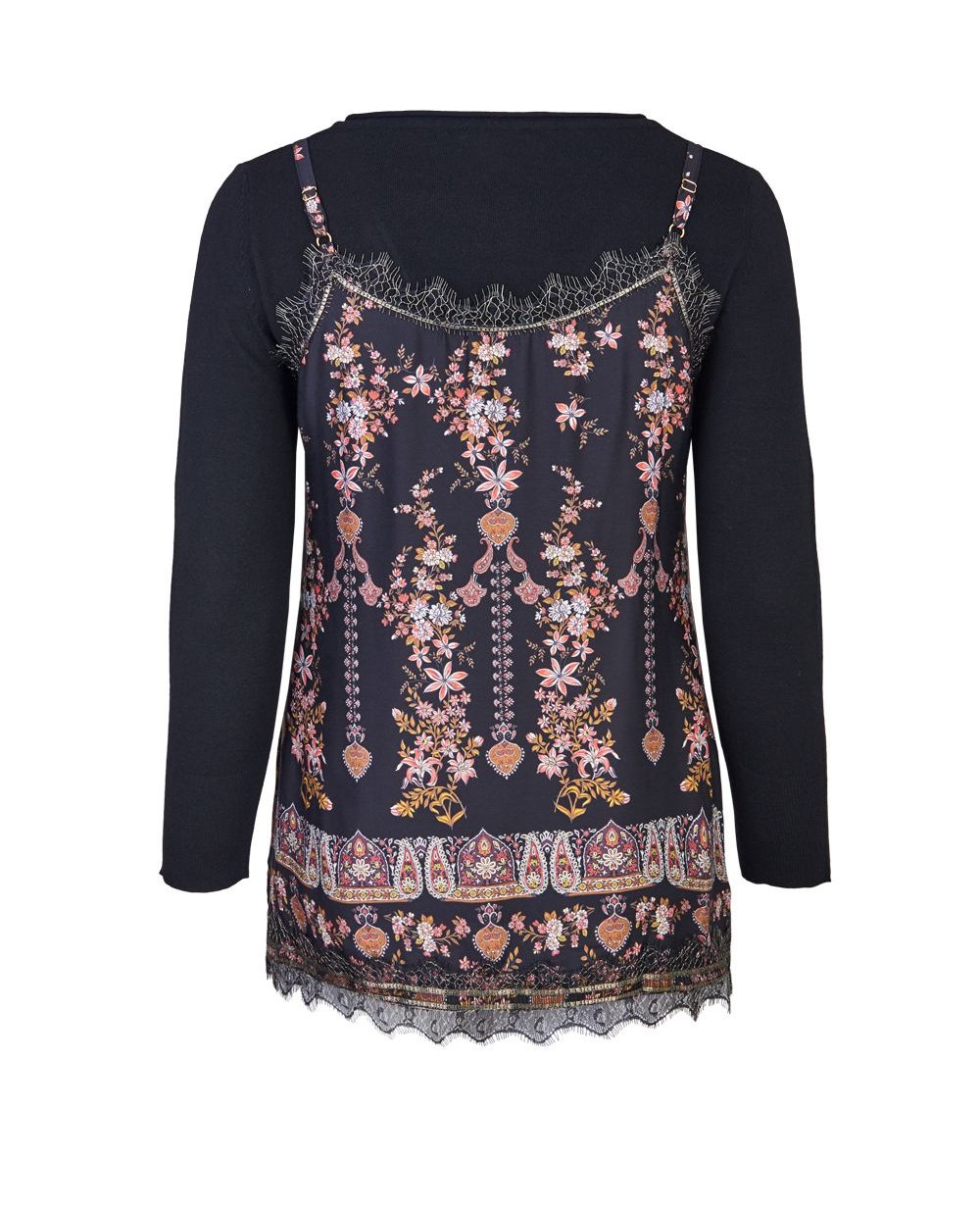 Костюм-двойка из коллекции Elena Miro Vanessa Incontrada состоит из трикотажного пуловера чёрного цвета с глубоким V-вырезом и удлиненного топа из вискозы.Топ декорирован кружевом, бельевые бретели регулируются по высоте.