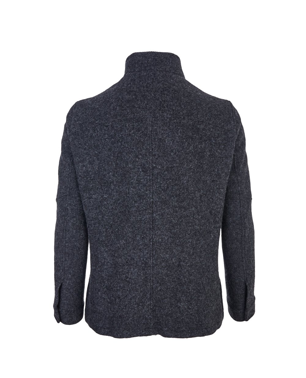 Плотное шерстяное полупальто серого цвета. Модель прямого кроя, застёгивается на молнию и пуговицы. Отложной воротник-стойка c трикотажной вставкой внутри. По бокам прорезные карманы. Спереди модель дополнена нагрудным карманом