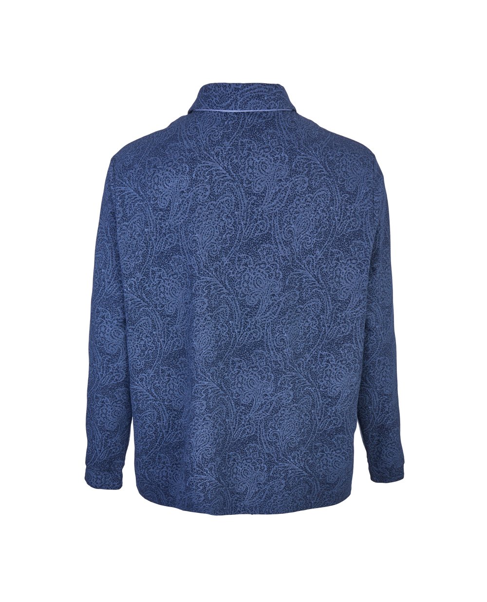 Хлопковое синее поло с оригинальным принтом. Прямой крой. Отложной воротник-стойка с застёжкой на 3 пуговицы. Манжеты рукавов на резинке