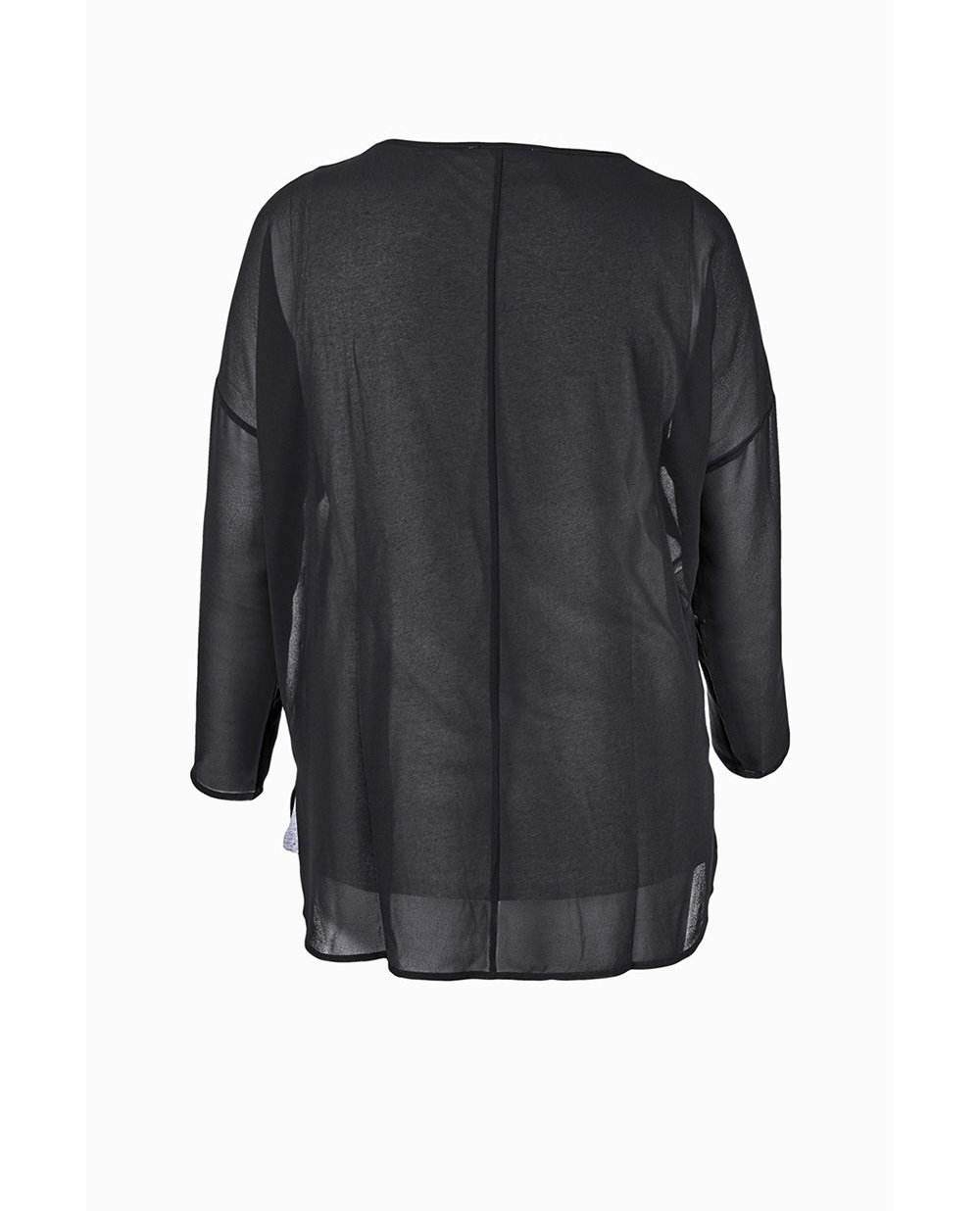 Джемпер выполнен из двух тканей с наложением. Нижняя часть цвета акулья кожа из высококачественного материала, верхняя часть из черного креп-жоржета. Приспущенный рукав, прямой силуэт, круглый вырез горловины.