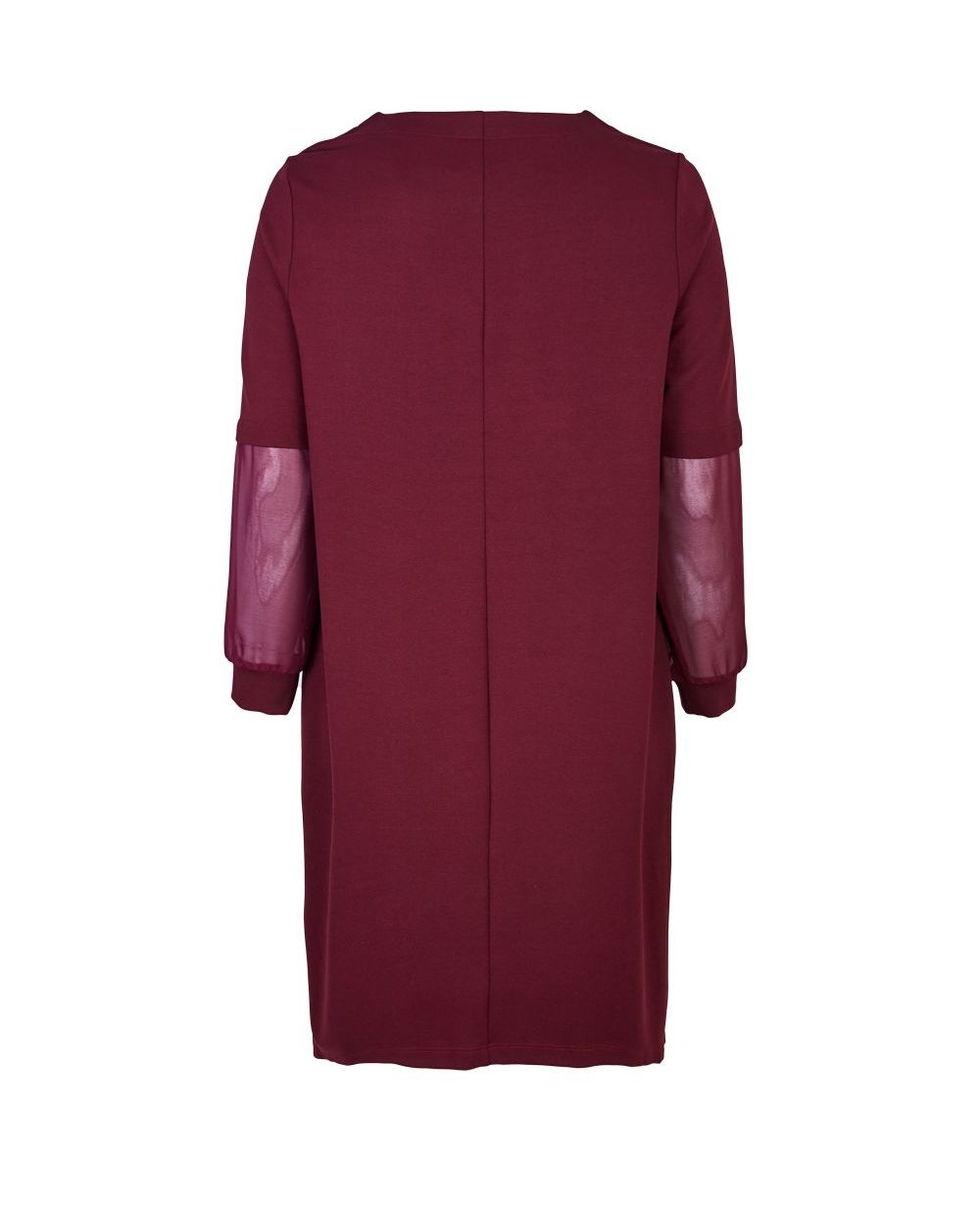 Платье-футляр из коллекции Verpass винного цвета из трикотажной вискозы. Круглый вырез горловины. Длинный втачной рукав с манжетами и вставками из прозрачного шифона. Длина изделия 102 см в размере 46.