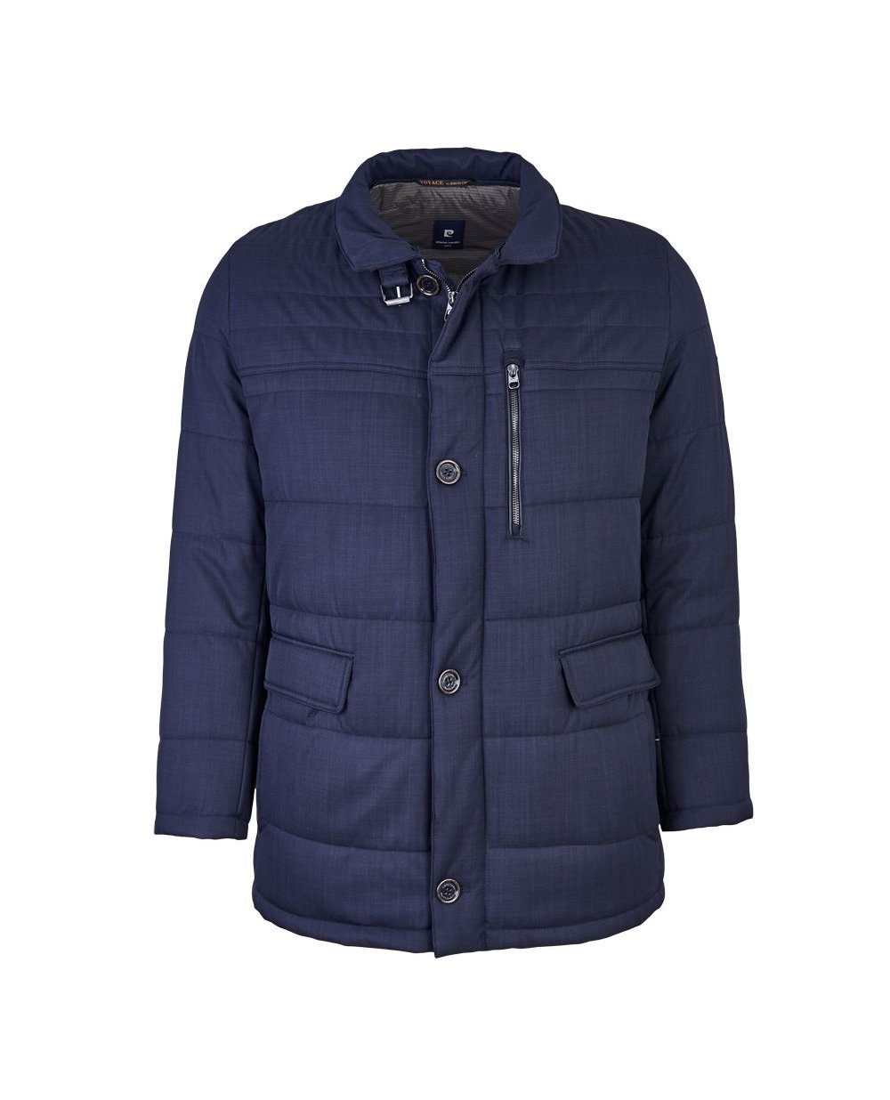 Стеганная куртка из коллекции Pierre Cardin прямого кроя темно-синего цвета. Теплый съемный воротник, застежка на скрытую под планку молнию и пуговицы. Спереди два кармана и 4 внутренних. Куртка ветро- и водонепроницаема, отлично сохраняет тепло, что делает её пригодной практически для любых погодных условий. Длина изделия в 58 размере 84 см.