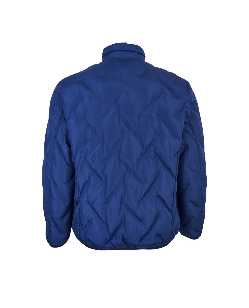 Синяя мужская куртка прямого кроя. Застёжка на молнию, высокая горловина-стойка. По бокам два прорезных кармана на молнии. Манжет рукава и низ куртки на небольшой эластичной резинке. Наполнитель мягкий и сверхлёгкий искусственный эко-материал
