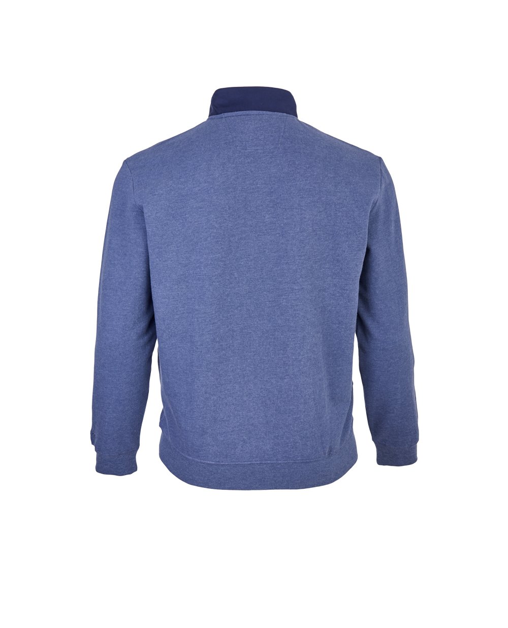 Синий трикотажный жакет на молнии. Особенности: прямой крой, высокий воротник, два кармана. Горловина, молния и швы на плечах декорированы вставкой контрастного цвета. Манжеты рукавов на резинке