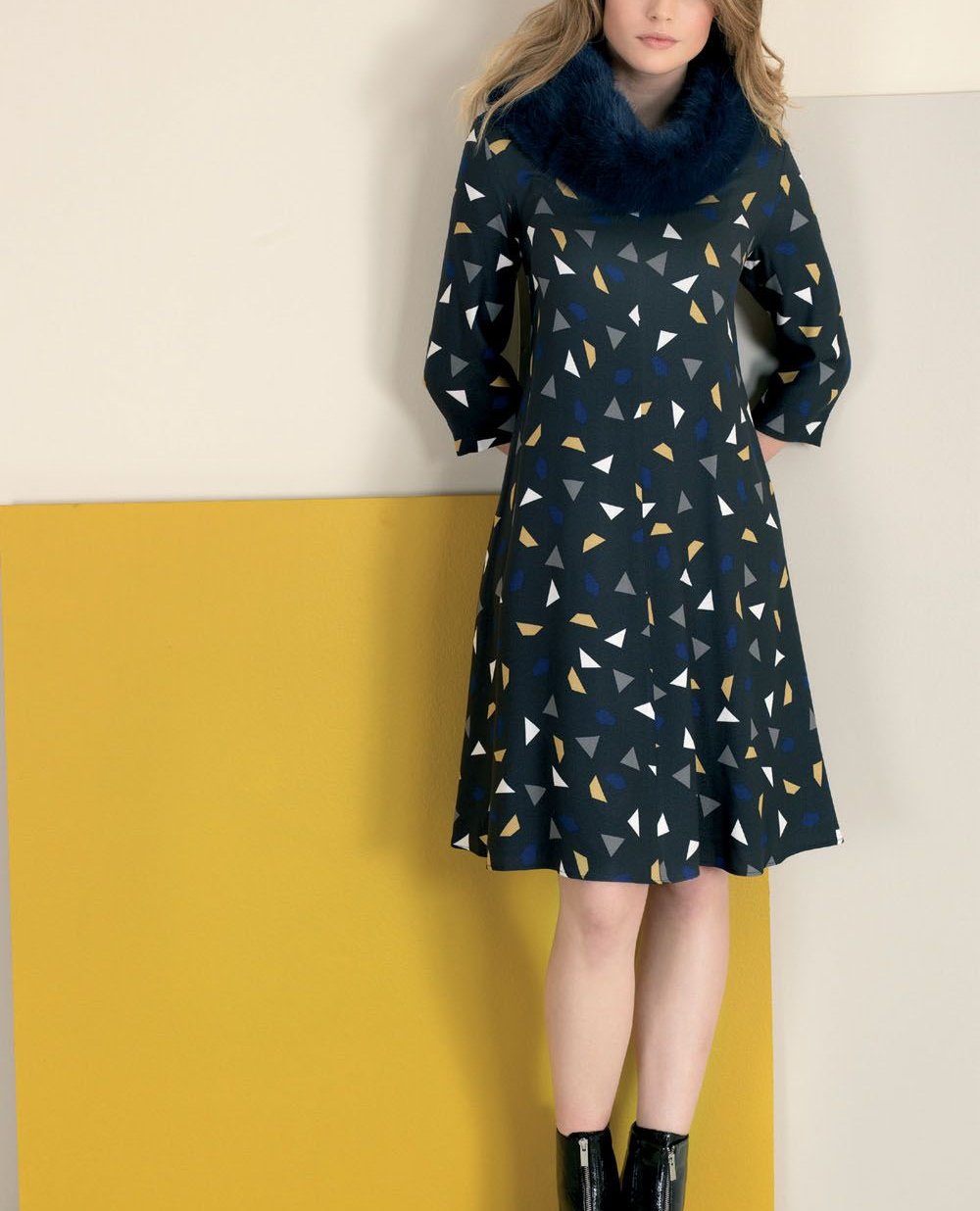Платье Elena Miro выполнено из мягкого материала с геометрическим узором. Модель приталенного кроя с расклешенной юбкой. Особенности: V-образный вырез, потайная молния сбоку, вытачки на груди, текстильная подкладка.