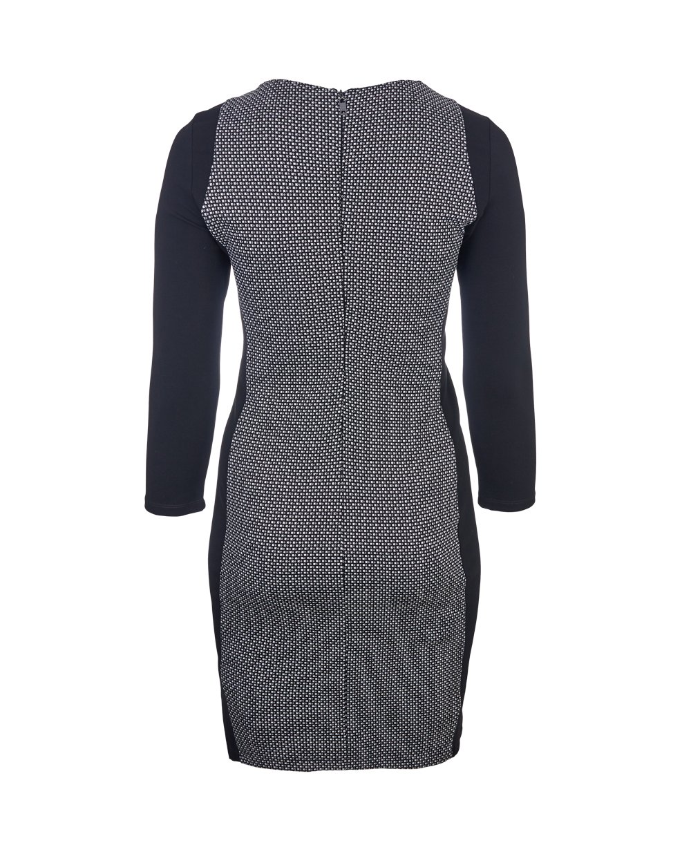 Платье-футляр из ткани Punto Milano с черно-белыми вставками спереди и сзади. На спинке молния-застежка и круглый вырез горловины. Длинные рукава и выточки по линии груди.