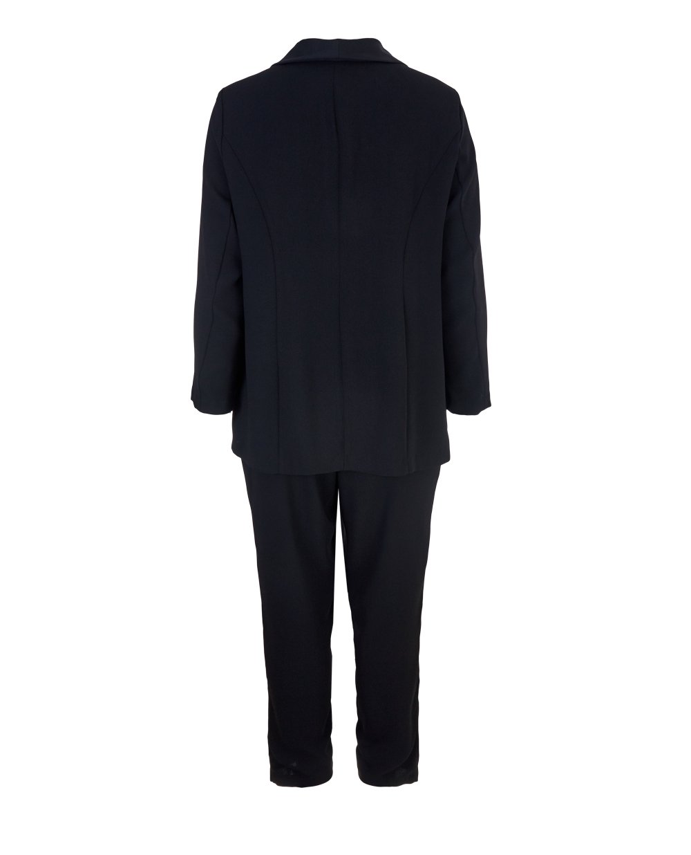 Брючный костюм из коллекции Verpass черного цвета, состоящий из жакета и брюк. Жакет приталенного силуэта с английский воротником из атласной ткани. Застегивается на потайной крючок и атласные ленты. Брюки зауженные к низу. Пояс на кулиске. По бокам прорезные карманы. Длина в 46 размере: жакета 83 см, брюк 105 см