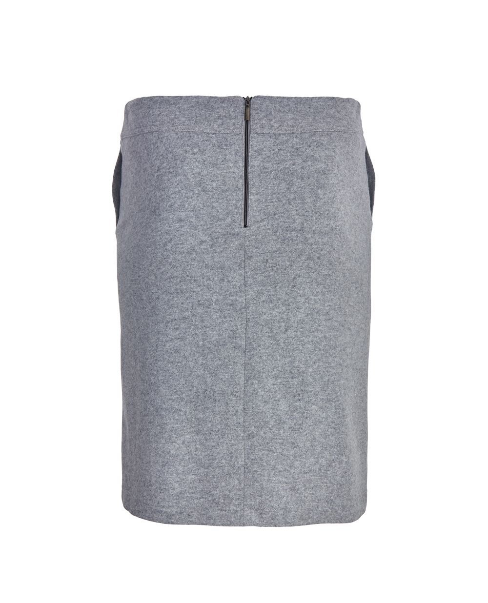Юбка Eugen Klein серого цвета из трикотажной набивной шерсти. Модель прямая, на подкладке, широкий пояс-кокетка, по бокам вертикальные карманы обработанные в рамку.