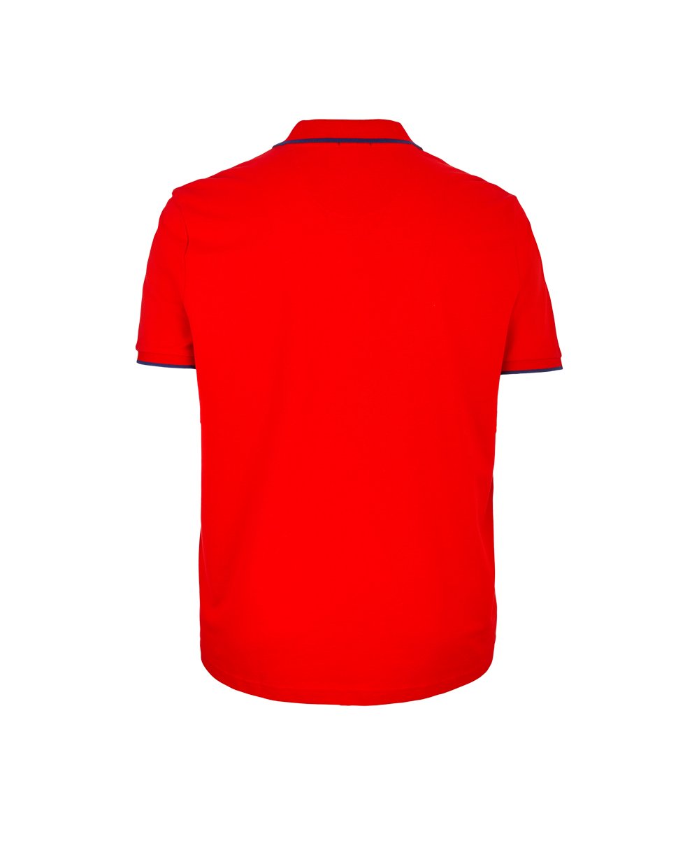 Поло из высококачественного 100% хлопка красного цвета. Горловина с отложным воротником, застёжка на три пуговицы. Низ рукава обработан резинкой. Воротник, манжет рукава и планка застежки декорированы контрастной полосой синего цвета.