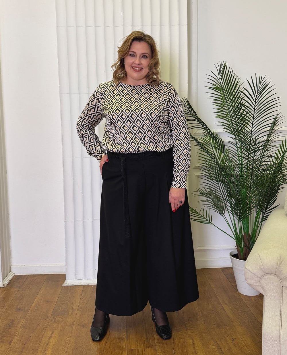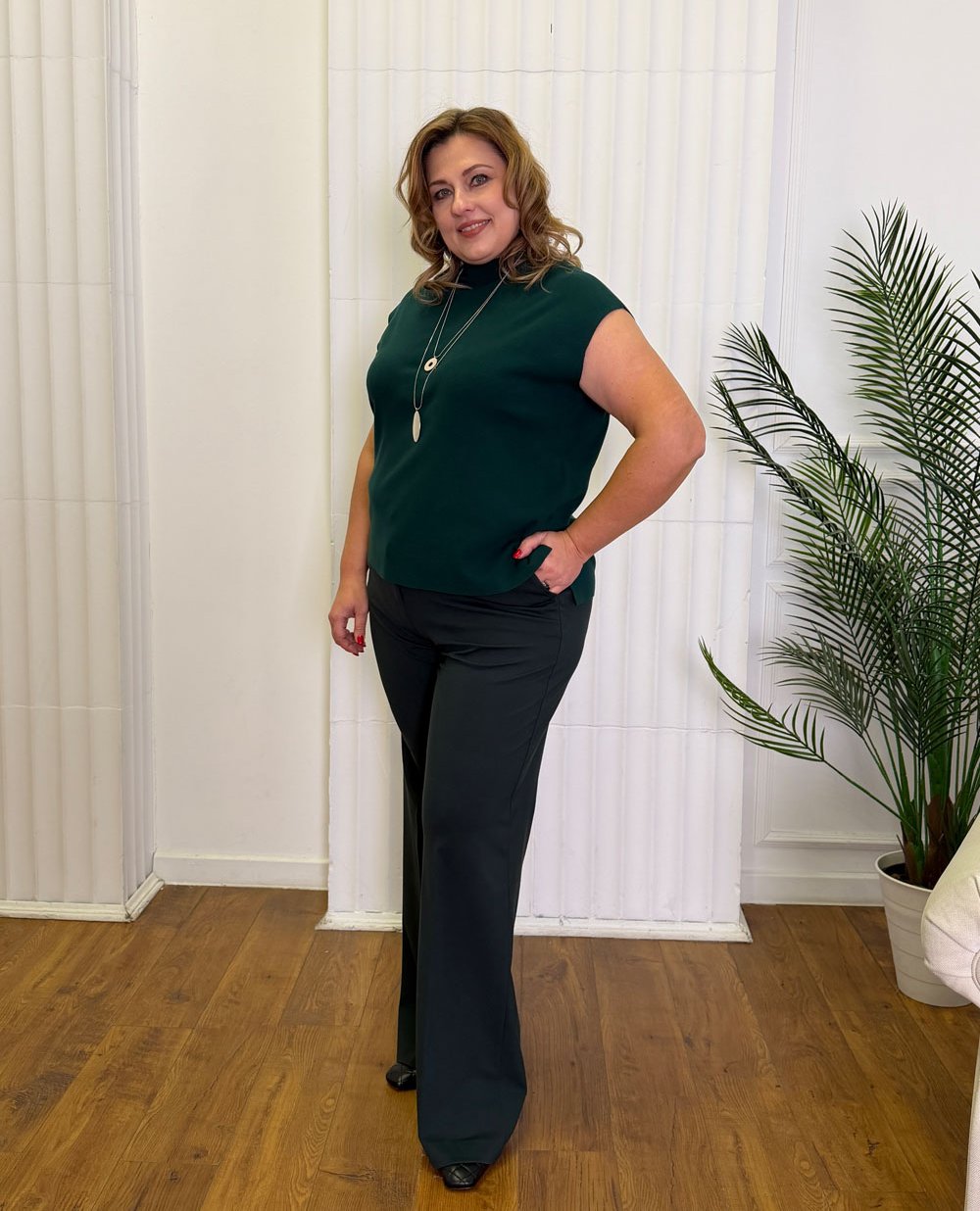 Нет смысла скрывать пышные бедра – им нужно придать особую форму с помощью брюк, которые визуально удлиняют силуэт.И кто сказал, что полной женщине нельзя носить узкие пояса на талии? Как раз узкий пояс и призван подчеркнуть всю мягкость и соблазнительность прекрасной формы.
