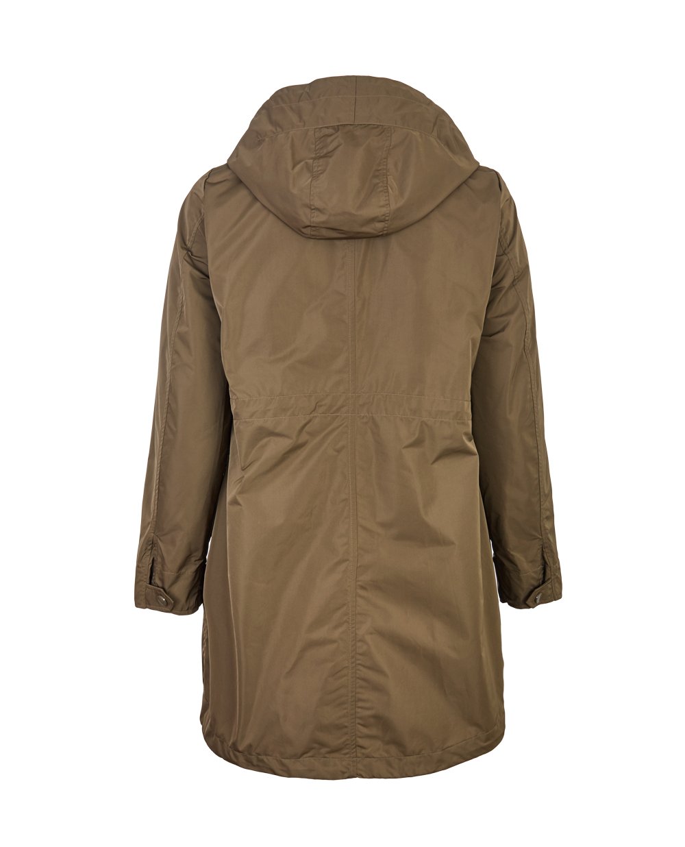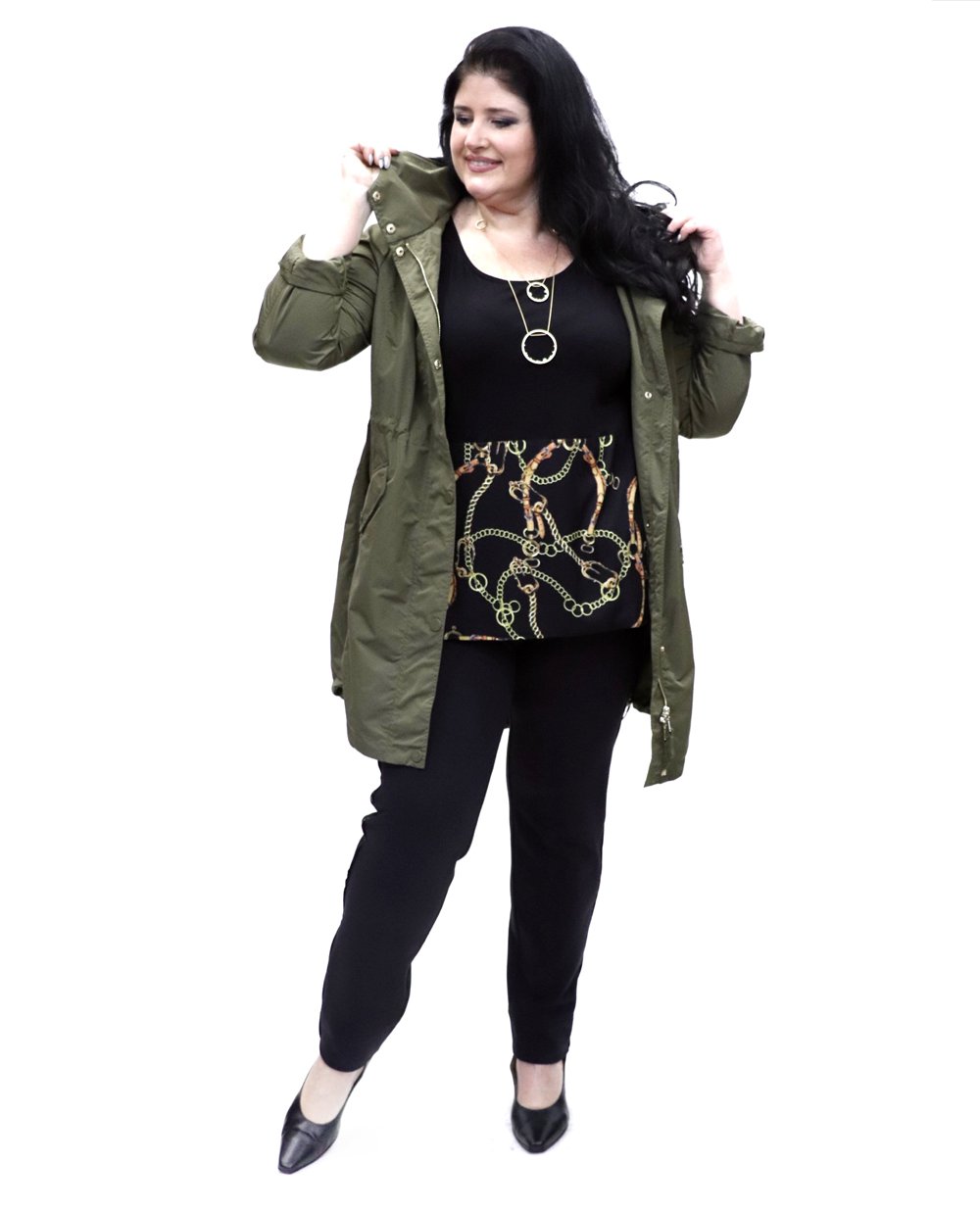 Ветровка-парка без подкладки из коллекции Elena Miro. Модель прямого, удлиненного кроя с капюшоном на кулиске по краю. Застежка на молнию и кнопки. Воротник стойка, длинный прямой рукав с застежкой на кнопку, капюшон не отстегивается. Спереди 2 косых кармана с клапаном на кнопке. Внутри в области пояса скрытая кулиска. Длина по спинке в 43 размере 90 см.