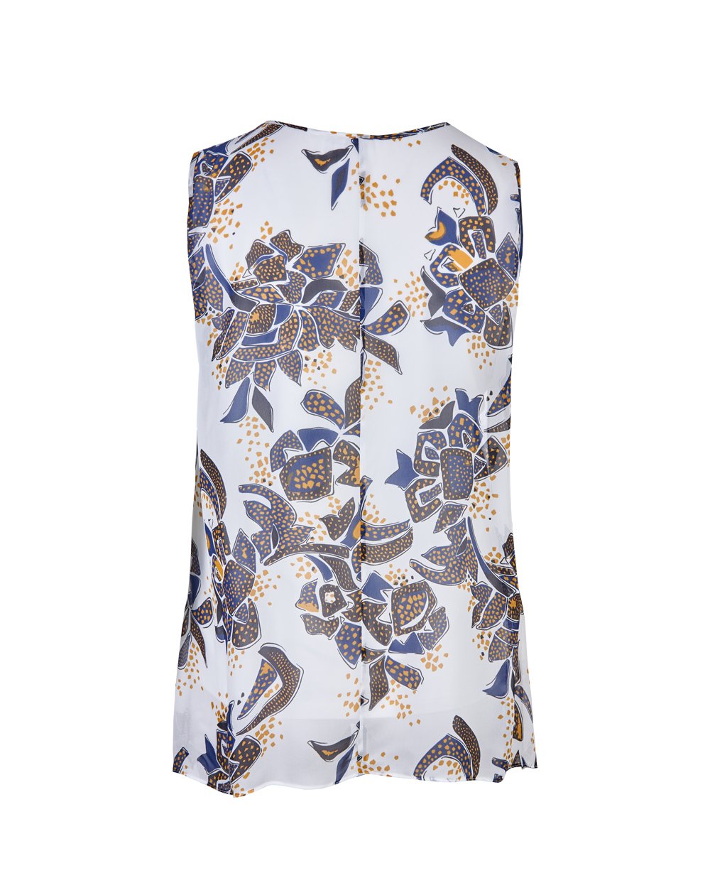 Шифоновый топ белого цвета с эксклюзивным печатным принтом - цветочная мозаика. Модель на трикотажной подкладке. Свободный крой, круглый вырез горловины декорирован пайетками. Длина в размере М 69 см.