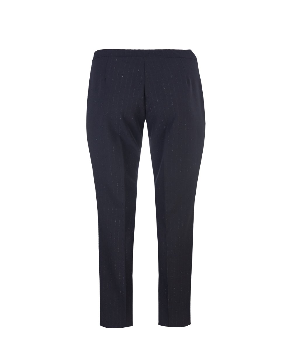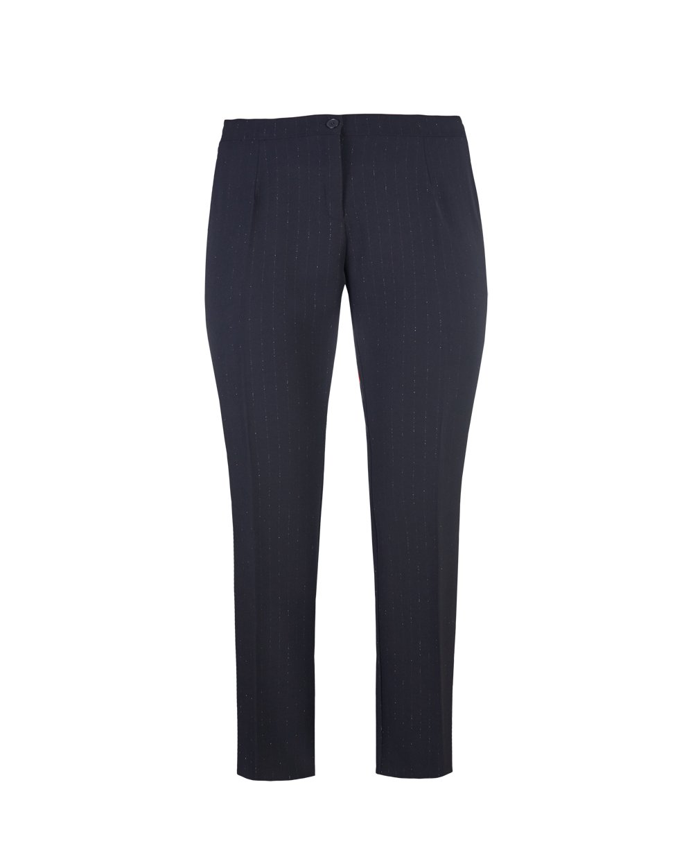 Брюки прямого кроя декорированы золотым напылением в виде вертикальных полос. Застежка на молнию и пуговицу. Сзади на поясе скрытая резинка. Длина в 43 размере 124 см