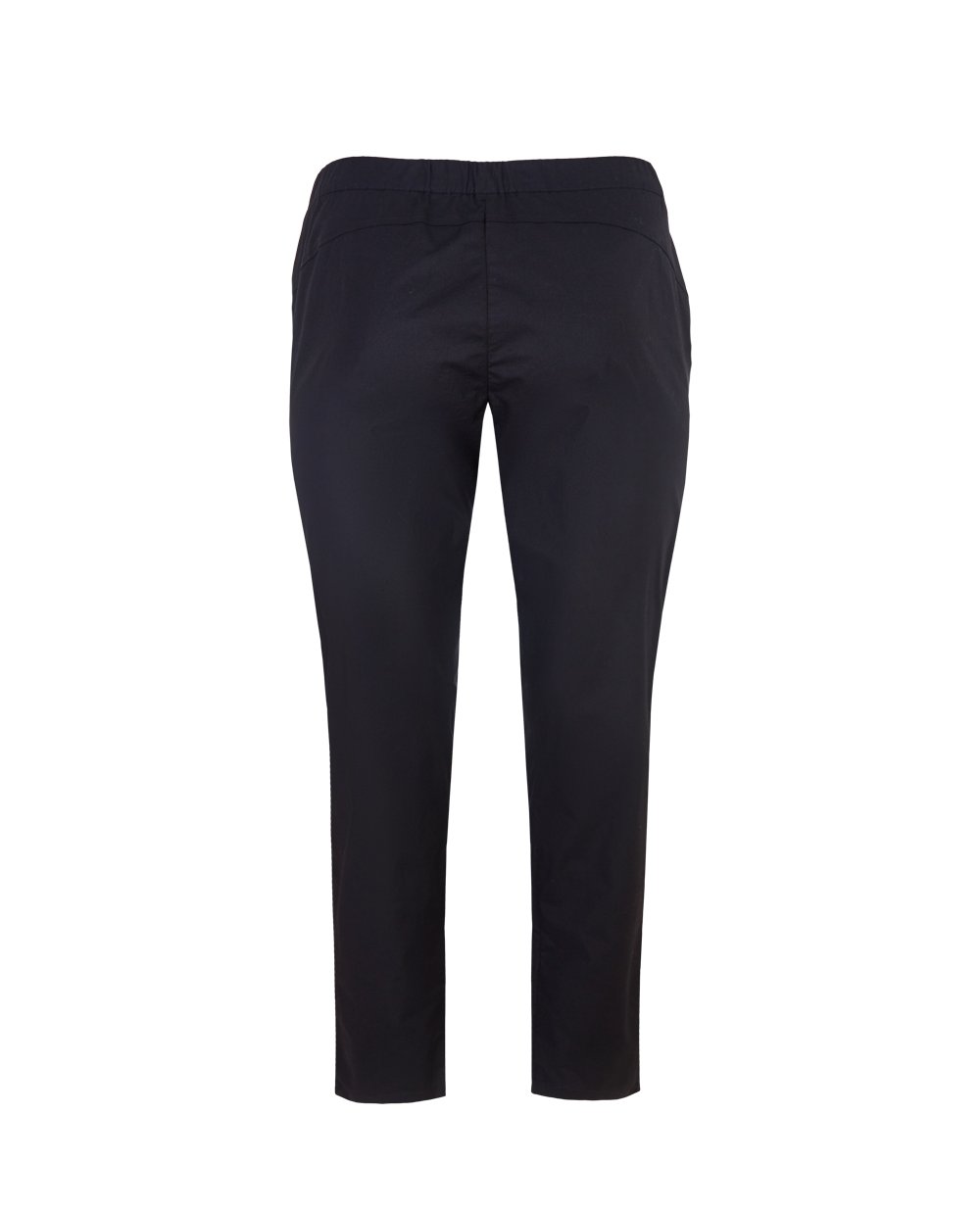 Брюки с высокой посадкой черного цвета из хлопковой эластичной ткани. Застежка на молнию и пуговицу. Пояс сзади на резинке. По бокам карманы и кулиска по поясу.