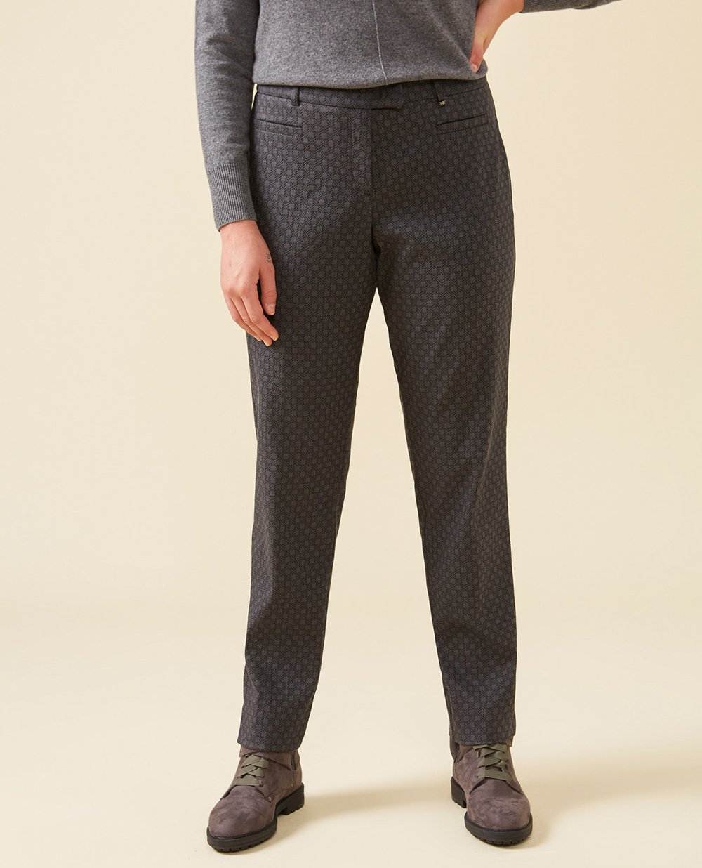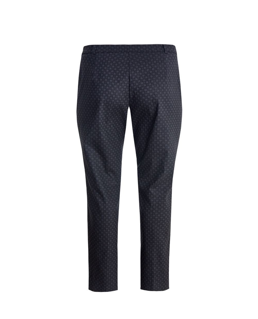 Брюки из коллекции Elena Miro White с геометрическим принтом. Зауженная модель с разрезами внизу по бокам, два небольших кармана спереди обработаны в рамку, застежка спереди на молнию под планкой.