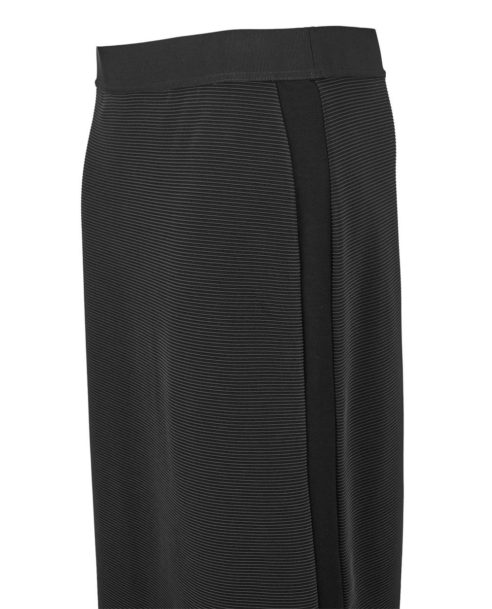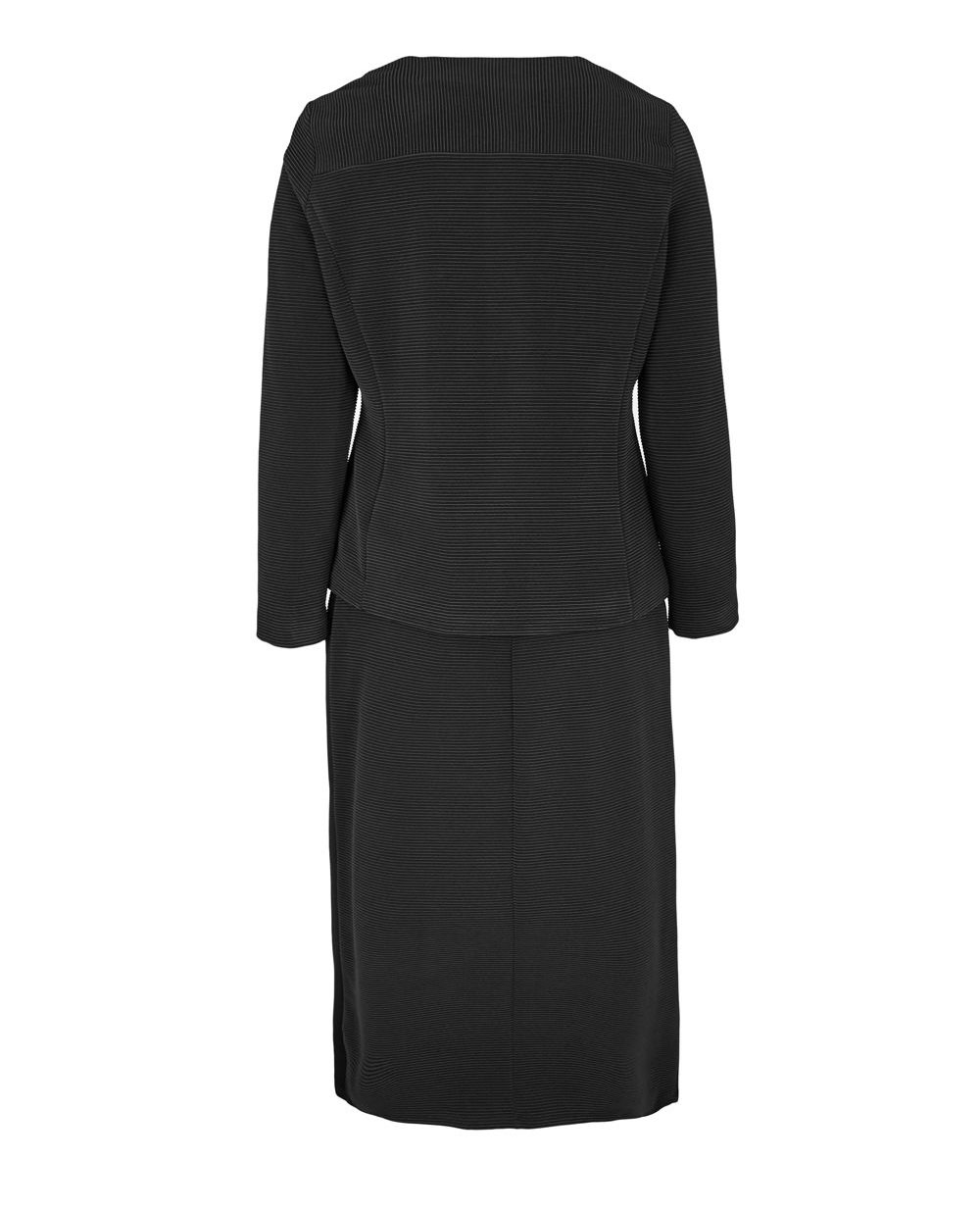 Элегантный юбочный костюм Elena Miro черного цвета из фактурной ткани, состоит из жакета и юбки. Жакет на подкладке, застежка на металлическую молнию, круглый вырез горловины. Спереди два прорезных кармана. Длина жакета 66 см в 44 размере. Юбка длины миди, пояс на широкой резинке. По бокам лампасы из гладкого трикотажа. Юбка без подкладки. Длина изделия 76 см в 44 размере.