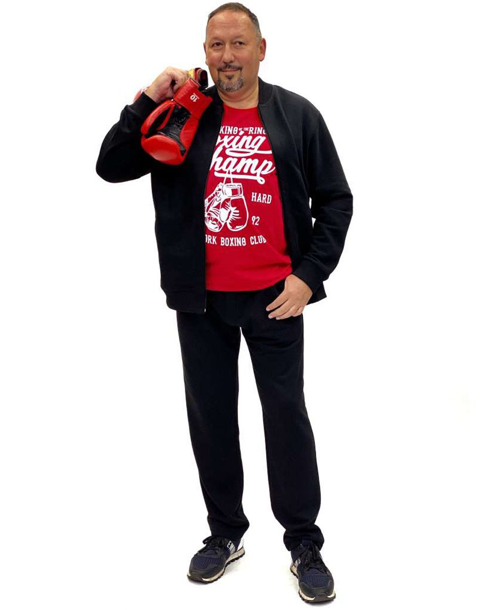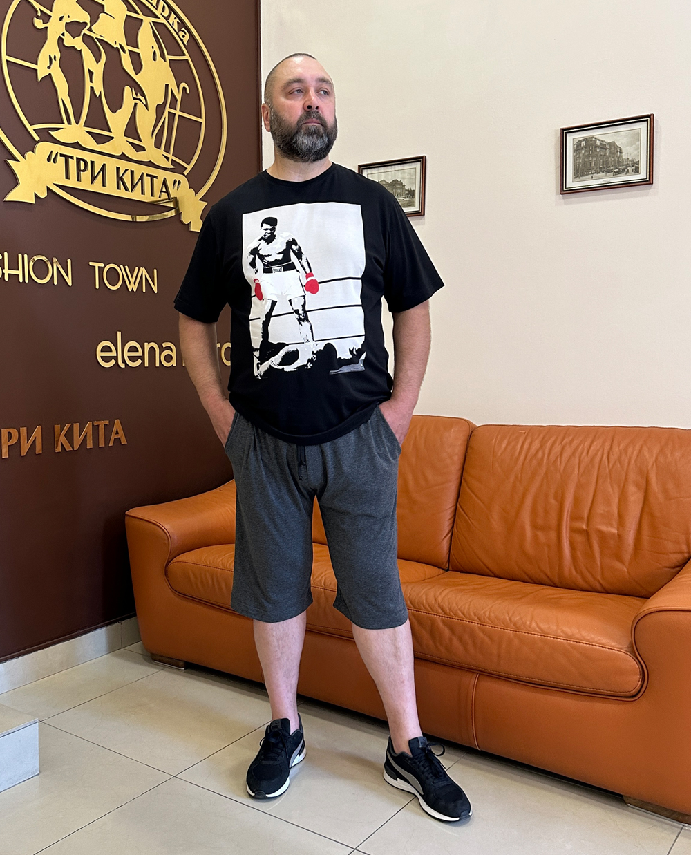 Если Вы цените комфорт и функциональность, вам понравиться такое сочетание чёрного костюма и яркой футболки. Модный принт подчеркнёт индивидуальность.